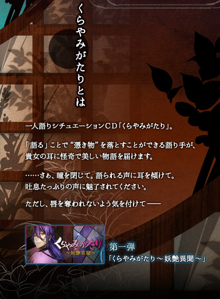 くらやみがたり~妖艶異聞~ 表演者 津田健次郎 发行时间 1725 出版者 ティームエンタテインメント 唱片数 1 条形码 豆瓣评分 84 61 人评价. Los últimos tweets de @kurayamibunko. 3/7/13 · 妖しく恐ろしげな怪談話“くらやみがたり”の第2弾。 今回も津田健次郎の演技力抜群な一人語りとダミーヘッドマイクによるサウンドを収録。 恐怖と悦楽の物語が存分に楽しめる。.