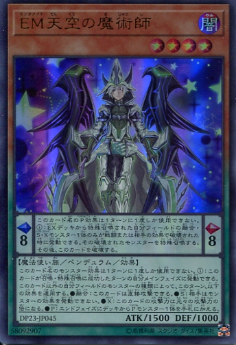 31/10/19 · EM天空の魔術師のボケ ボケを作成 ボケを見る(0件) 更新情報 new 新商品 dawn of majesty 発売!!. EM天空の魔術師ウル 平均評価:85 コメント数:2 ペンデュラムモンスター 星 4 / 闇 / 魔法使い族 / 攻1500 / 守1000 モンスター効果 このカード名のモンスター効果は1ターンに1度しか使用できない。 ①:このカードが召喚・特殊召喚に成功したターンの自分メインフェイズに発動できる。 このカード以外の自分フィールドのモンスターの種類によって.