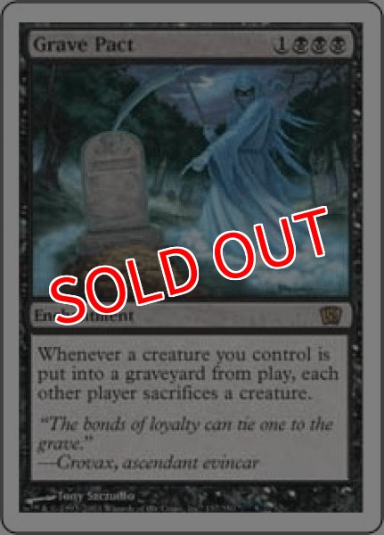 《墓穴までの契約》 エンチャント あなたがコントロールするいずれかのクリーチャーが場からいずれかの墓地に置かれるたび、他のプレイヤーはそれぞれクリーチャーを1体生け贄に捧げる。 忠誠の絆は、墓穴の中までつながっているのだ。. > 日本語墓穴までの契約/Grave Pact ログイン ログイン;.